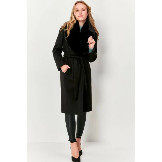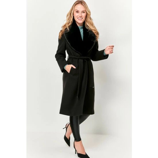 This black coat features a detachable fur collar, a tie waist and pocket detailing. Cut with a long line and semi-structured silhouette, this classic coat boasts sophistication and style.