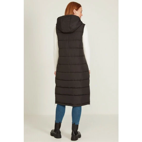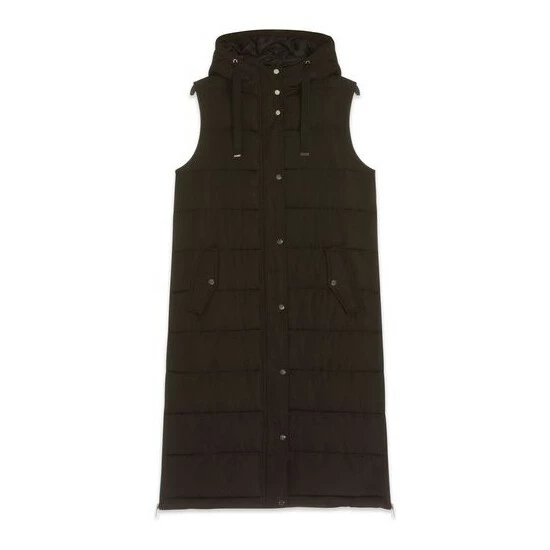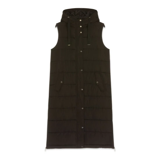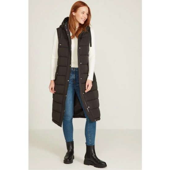 This longline black padded gilet is the perfect transitional piece to see you through the upcoming seasons, featuring a classic drawstring hood, side pockets and a full-zip fastening.
