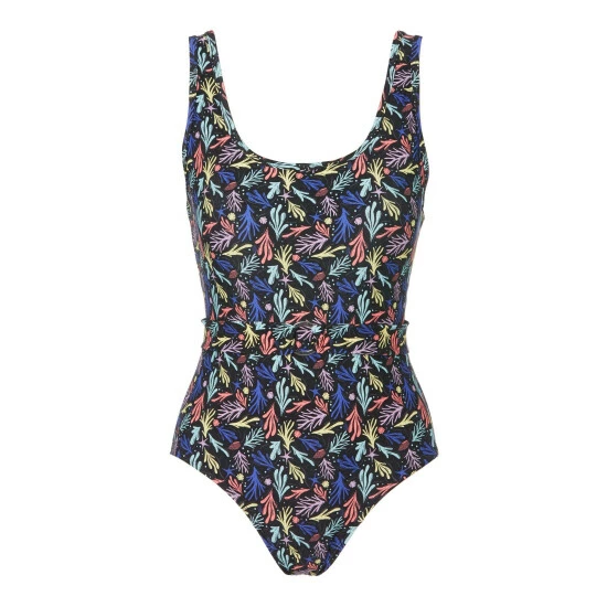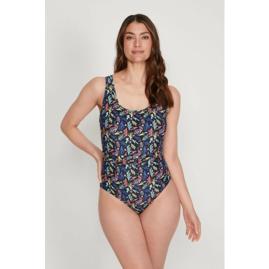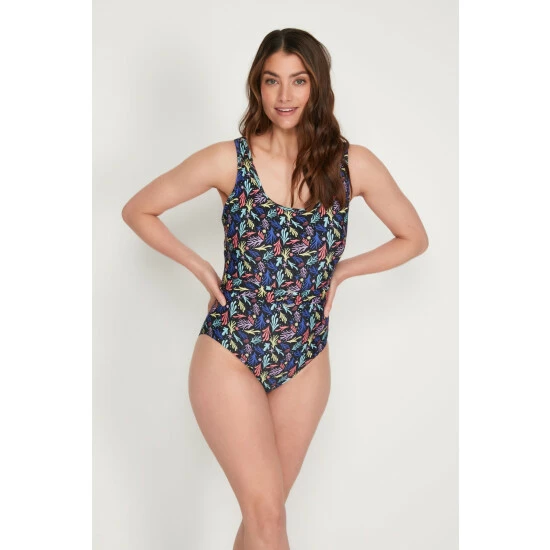 Get ready for holiday season with this statement print swimsuit. This swimsuit is fully lined for extra support and features a flattering tummy control fabric, adjustable wide straps for added comfort and a scoop back.