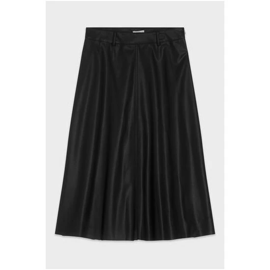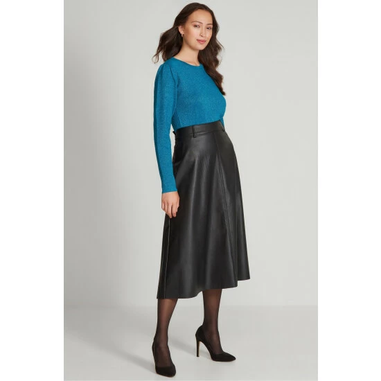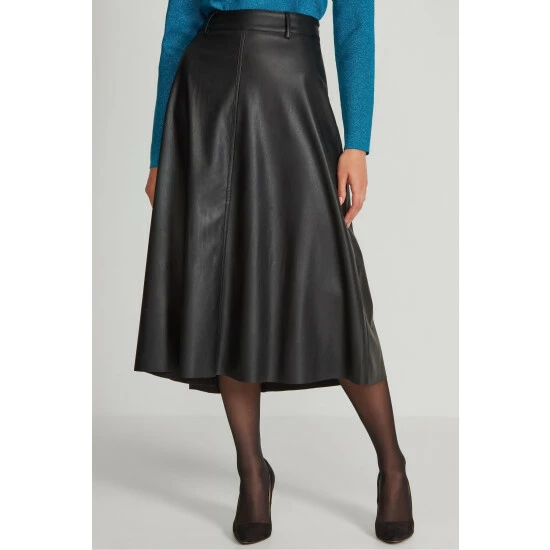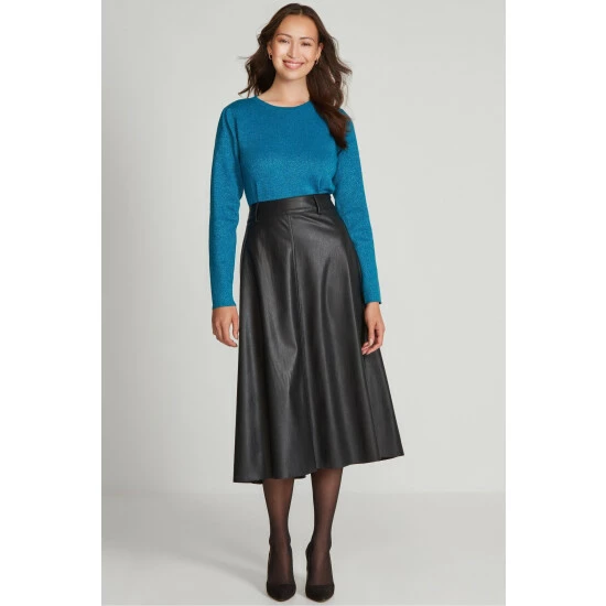 Turn heads this season in our new faux leather midi skirt in black, designed in a classic A-line shape. Style this piece with a long sleeve top, black tights and heels for a classic look with an edge.