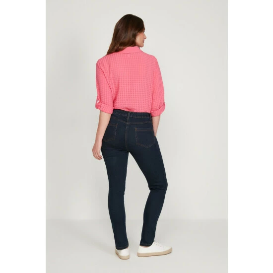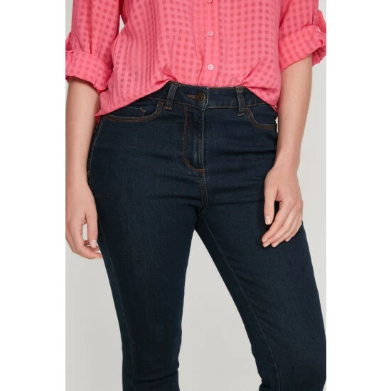 Our dark indigo slim leg jeans feature a button zip fly and five pocket construction. A flattering cut for all figures, pair with slouchy knit jumpers and trainers or chic blouses and heeled boots.