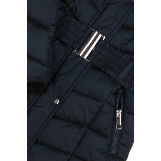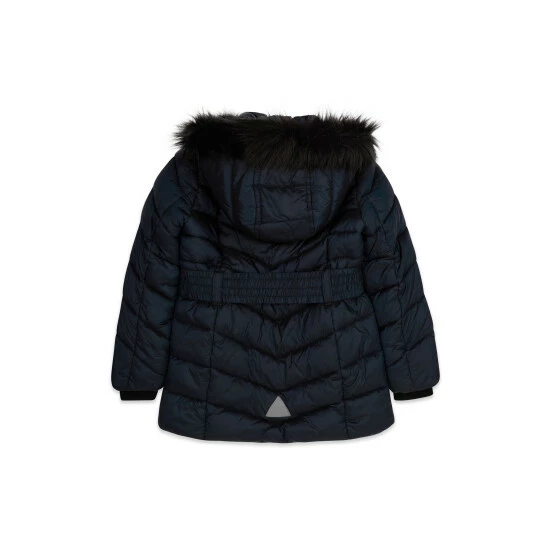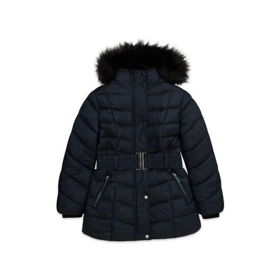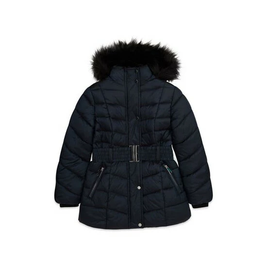 Keep her warm and cosy this season with this belted padded coat. This girl’s jacket comes in a navy colour boasting long sleeves, a faux fur trim hood, front zip fastening and zip pockets. Contains recycled polyester.