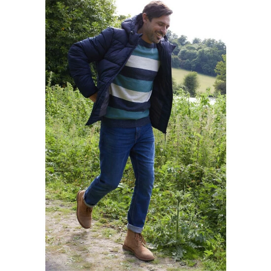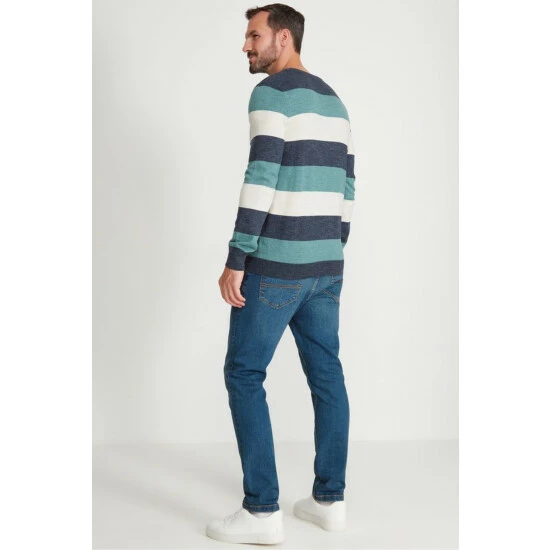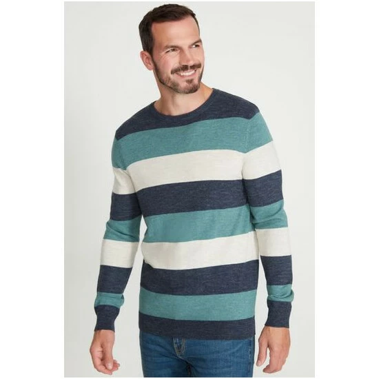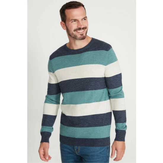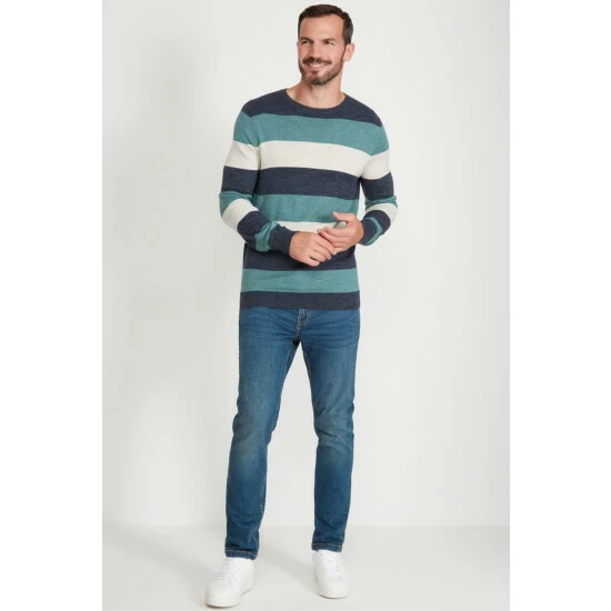Stay warm this season with our new teal block stripe jumper. This horizontal striped design is easy for layering and features a classic crew neck. Style with jeans and trainers for an easy, every day look.