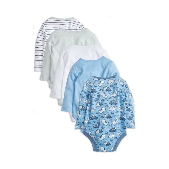 This pack of five long sleeved bodysuits is a baby essential. With envelope necklines and inside leg popper fastening for easy dressing, the 100% cotton will be soft and comfortable against their skin.