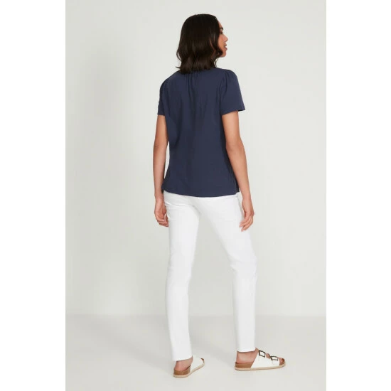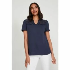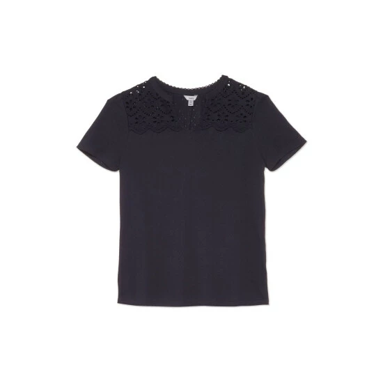 This top features short sleeves, a notch neckline and pointelle lace detailing.