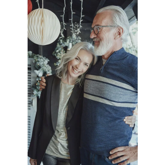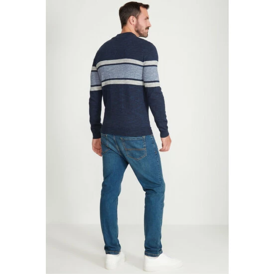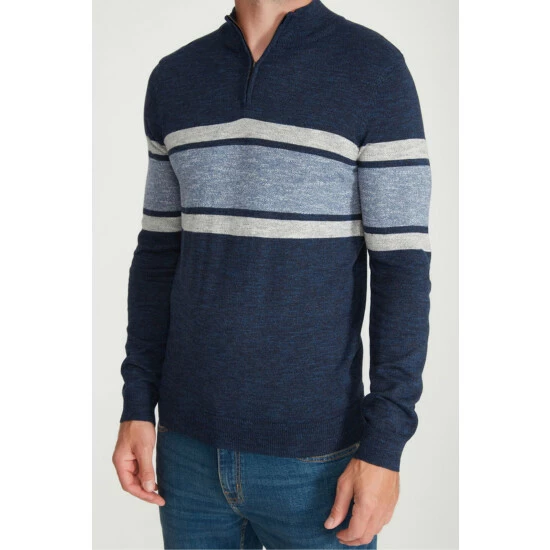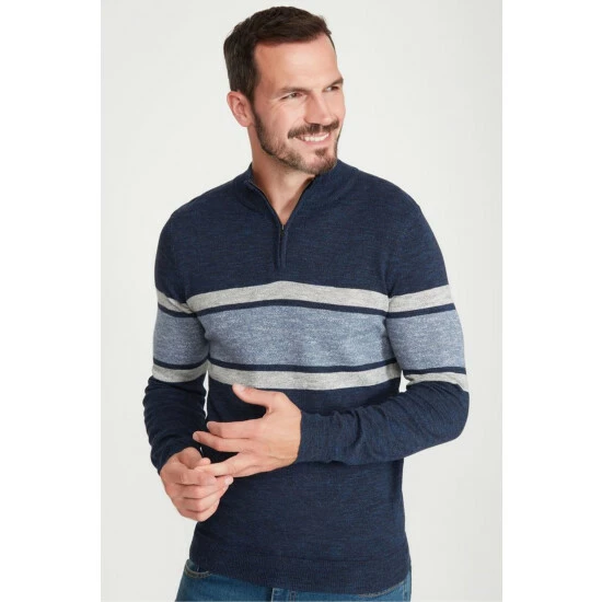 A must have for your casual wardrobe. This denim blue half zip knitted jumper boast across the chest. An easy wear, style this with jeans and trainers for a casual day to day look. Contains recycled polyester.