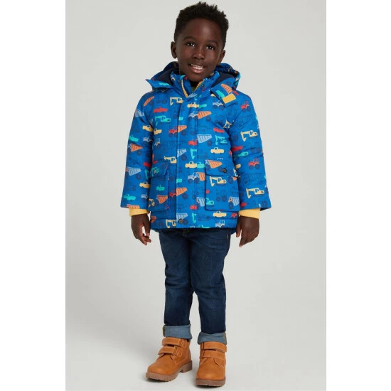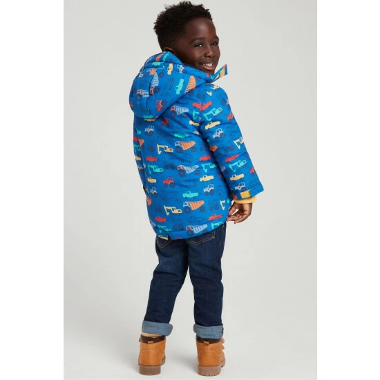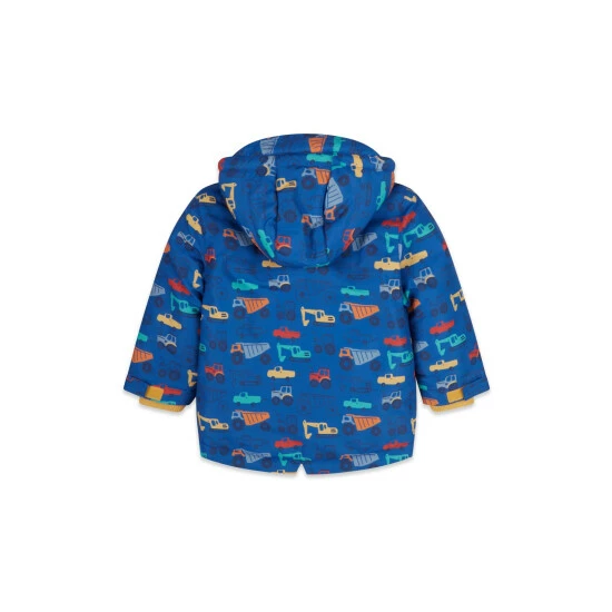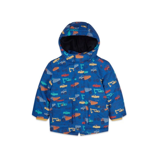 This blue boys coat is fully lined with a hood and has been designed with an all-over truck print, perfect for all of his outdoor adventures. Contains recycled polyester.