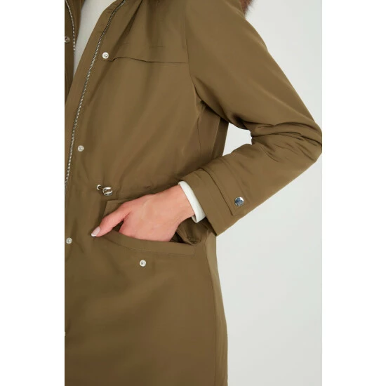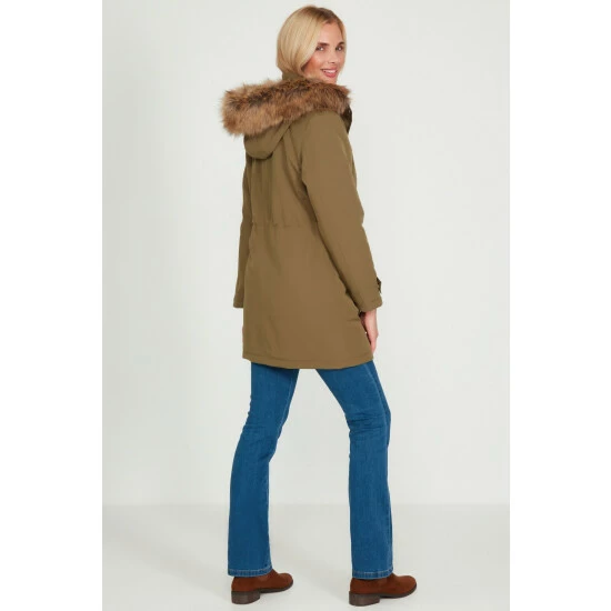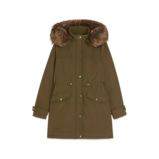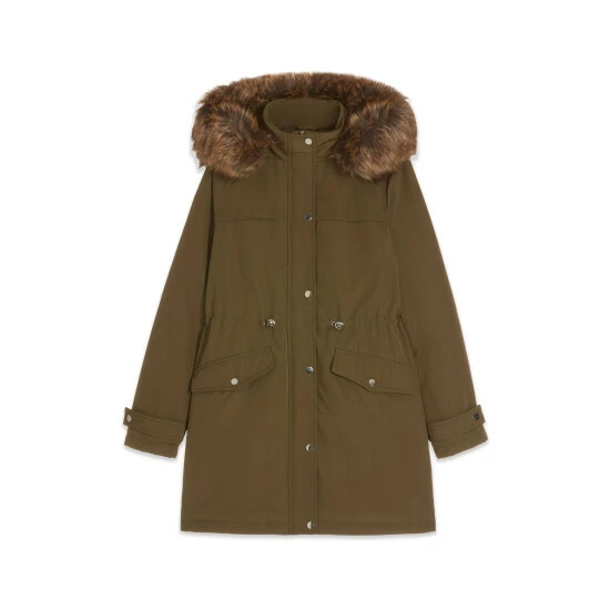 The perfect jacket for your winter wardrobe has arrived! This jacket features a hood with faux fur inner lining and detachable faux fur trim with a full length zip fastening. Featuring front pockets with added button poppers. Perfect for those colder months.