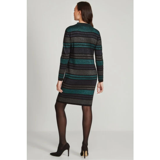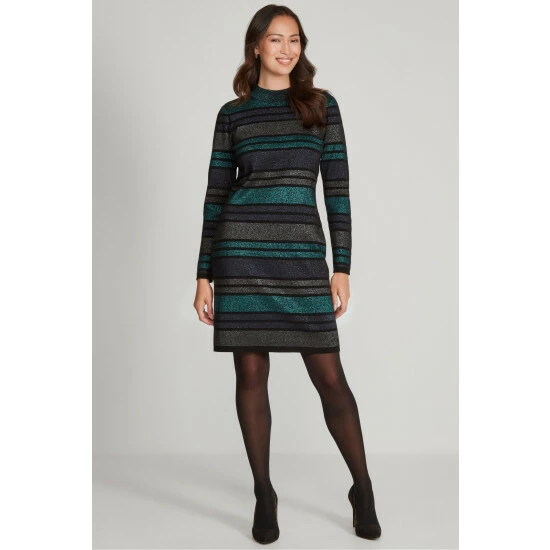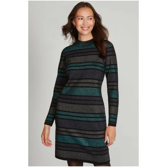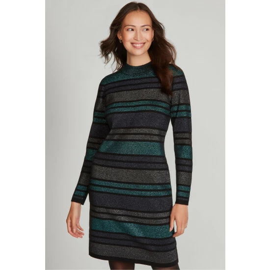 Step into the new season with our green metallic striped dress, designed with long sleeves and a bodycon fit. Style with black tights and boots for a trendy A/W look. Contains ECOVERO™.