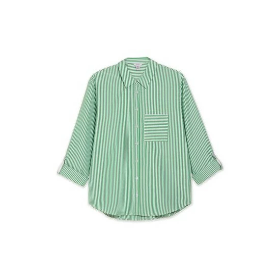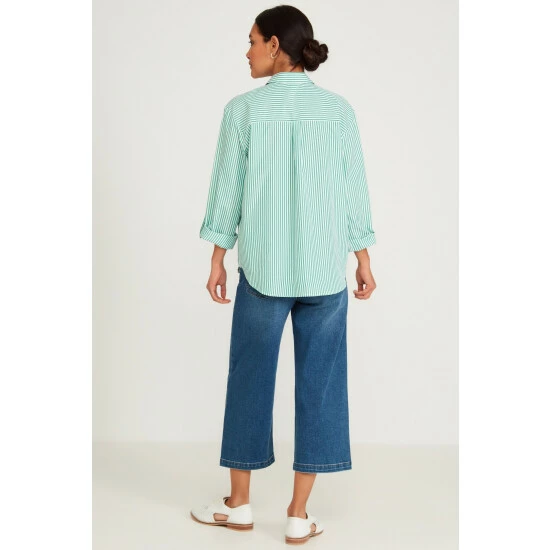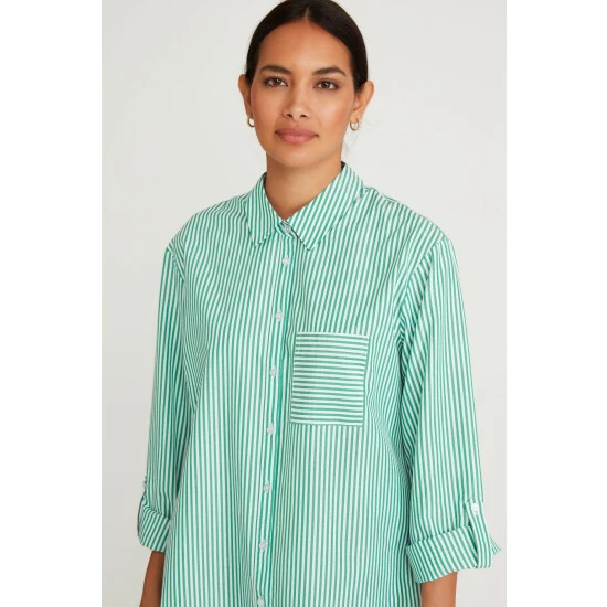 Smarten up your wardrobe this season with this green poplin stripe shirt. Featuring a comfortable fit with a collared neckline and button-through fastening. Style with jeans and a black boot for a trendy twist on a classic look.