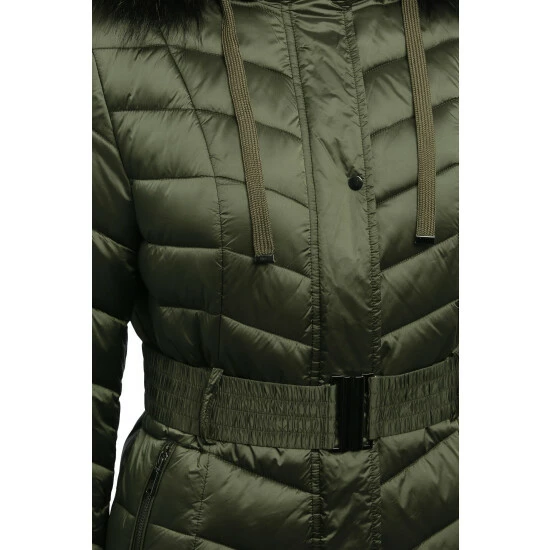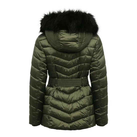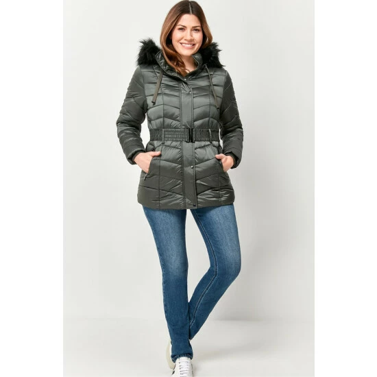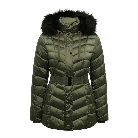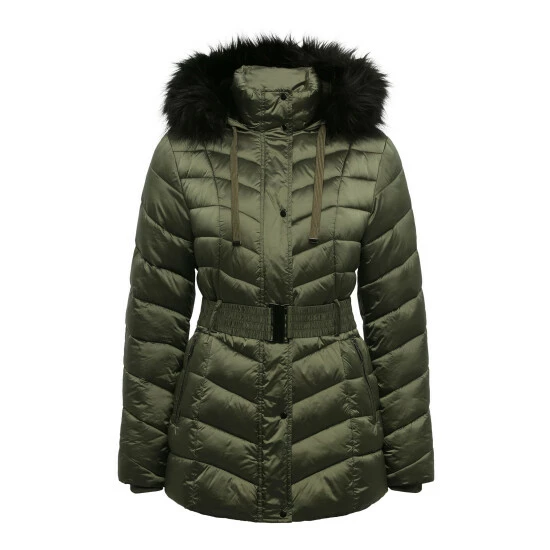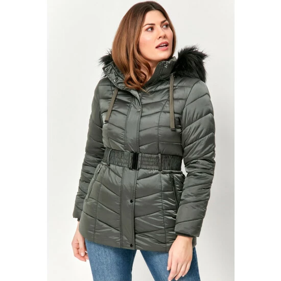 Prepare for the colder months with this cosy short puffer coat. This coat is shower resistant and features a shorter length, long sleeves, a faux fur hood and a full zip with additional belt detail.
