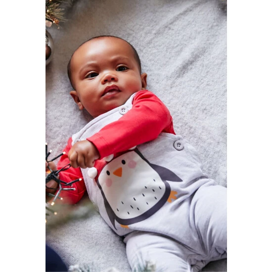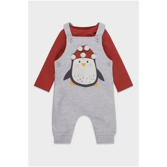 Have your little one looking adorable this festive season in our grey dungarees complete with a Christmas penguin design and long sleeve red top.