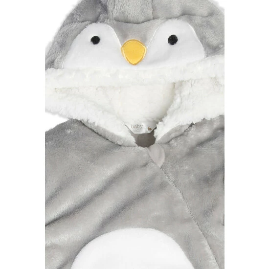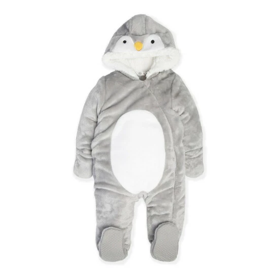 Keep them cosy this winter with our grey and white penguin snowsuit. Features a cute hood, a furry lining, a fur trimmed hood, long sleeves with hand coverings and a long zip.
