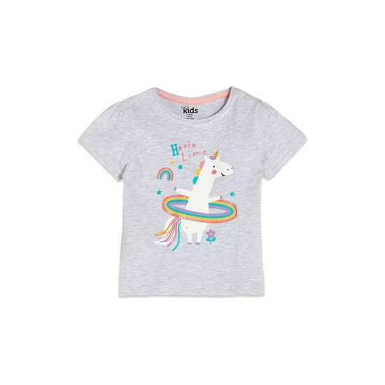 This girl’s grey marl T-shirt features short sleeves, a crew neckline and a rainbow unicorn design on the front. Pair with leggings for an easy everyday look she will love.