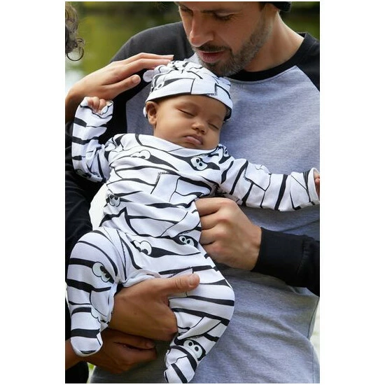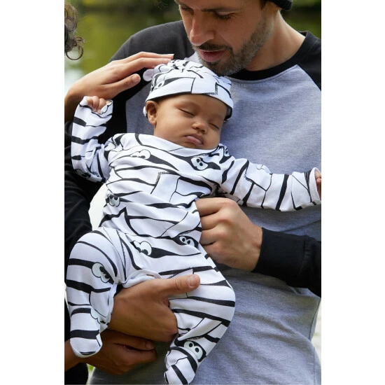 This black and white sleepsuit features a popper fastening, long sleeves and integral feet. Designed with a seasonal Halloween mummy design, this sleepsuit comes with a matching hat.