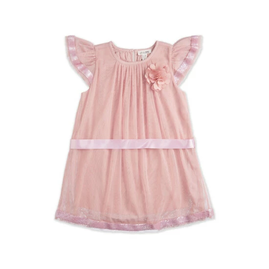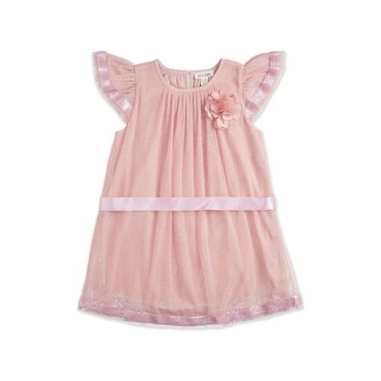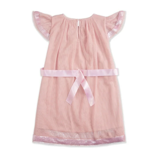This Kite and Cosmic aline chiffon pink dress featuring cap sleeves, with gathering around neckline, sequin trim around sleeves and hem. Finished with matching pink ribbon belt makes a ideal party favourite.