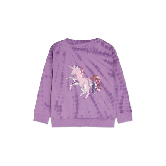 This 100% Cotton cosy AOP Tye Dye Sweat with sequin unicorn motif, pair with the jeans or matching jogger for casual look. Featuring rib detail on cuff and hem.