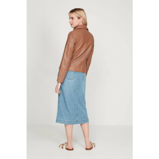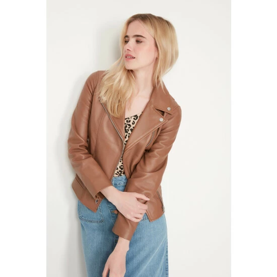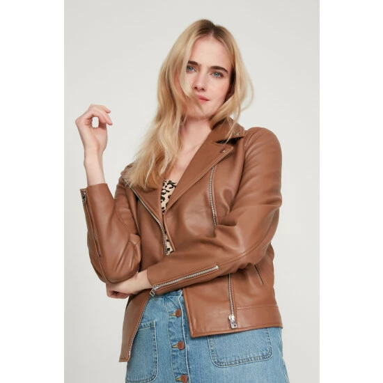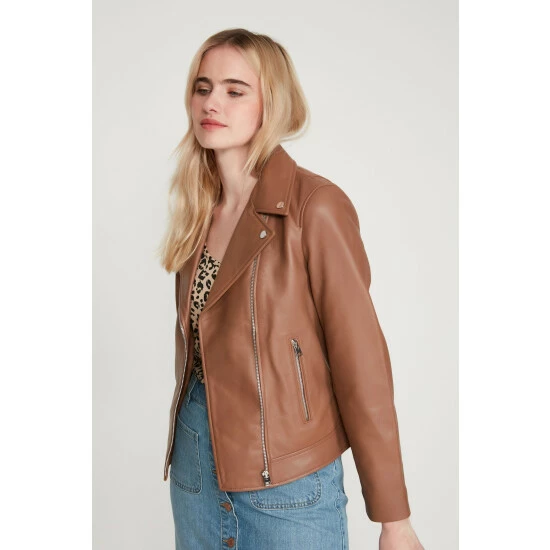 Get ready to look effortlessly cool with our new leather jacket! Cut in a classic biker silhouette, this genuine leather jacket features silver zip detailing, zip side pockets, silver studs and is fully lined for added ease of layering. Layer over a midi dress for a stylish spring look.
